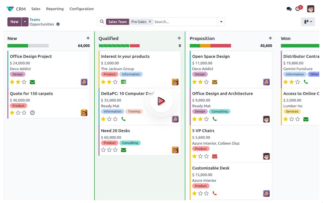 Odoo CRM ofrece una vista clara y visual del pipeline comercial, permitiendo a los equipos trabajar más rápido y con mayor control.