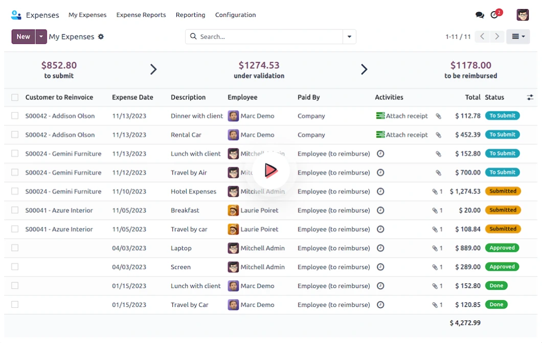 Odoo es un sistema ERP y CRM todo‑en‑uno que te permite gestionar y controlar los gastos de tus empleados con integración completa con tu contabilidad, todo desde una única aplicación.