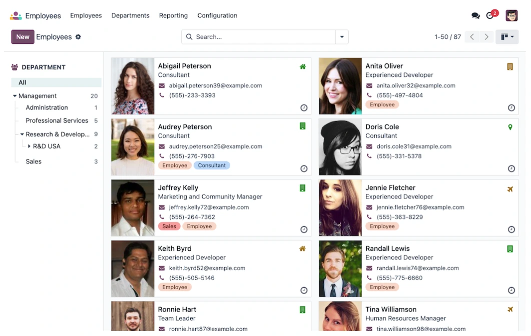 Odoo es un sistema ERP y CRM todo‑en‑uno con una solución de RRHH completa: publica ofertas de empleo, gestiona procesos de selección, contratos, ausencias, partes de horas y mucho más desde una única aplicación fácil de usar.